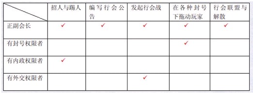 d、会长权限:会长拥有之上的所有权限,并且是唯一有权限处理行会结盟的申请与取消联盟的功能。唯一编辑行会公告的权限。正副会长可以把任何人踢出行会。正会长可以踢出副会长,副会长不能踢出正会长。